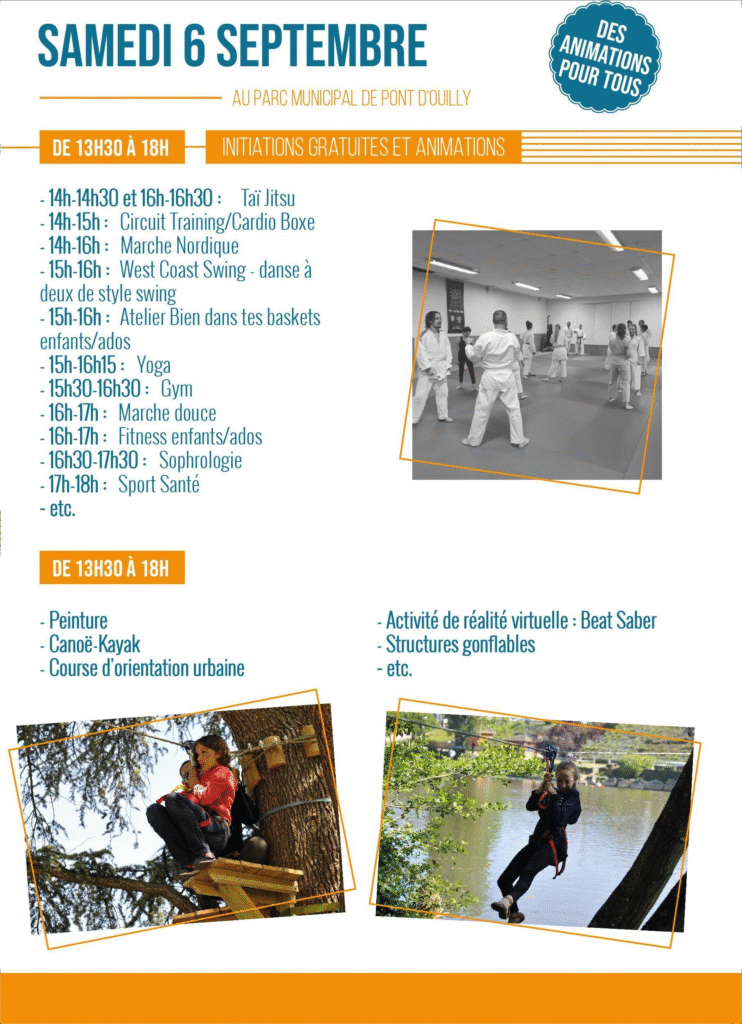 🕒 Démonstrations & ateliers : yoga, sophrologie, cardio boxe, marche nordique, danse West Coast Swing, “Bien dans tes baskets”, fitness enfants/ados, gym, sport santé, Taï Jitsu…